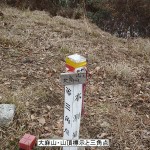 板町高松道側道奥宮登山口から取り付く。少し冒険心をおこして保守路から登る、良く整備されて歩き良い。小さな涸沢をいくつもこして最後やはり水量はないが河原を暫く歩き尾根に取り付く。ブッシュ漕いでやっと視野の開けたミカン畑に出る。杉の植林帯の登りになるが、踏み跡はない。その上シダが深くて悪戦苦闘、もちろん道はない、シダの海を搔き分けやっと歩き良い稜線に出て四等三角点関柱に向かう。三角点から三軒屋から登ってきた道に下りTAさんが登った藍染山南尾根を登り、帰りは通常の登山道を高尾山・奥宮登山口に帰る予定が関柱から降る道が凄いブッシュ頭も入らない此処で8の字コ-スはあきらめて鉄塔まで行って食事して帰った。再度挑戦してみたい。